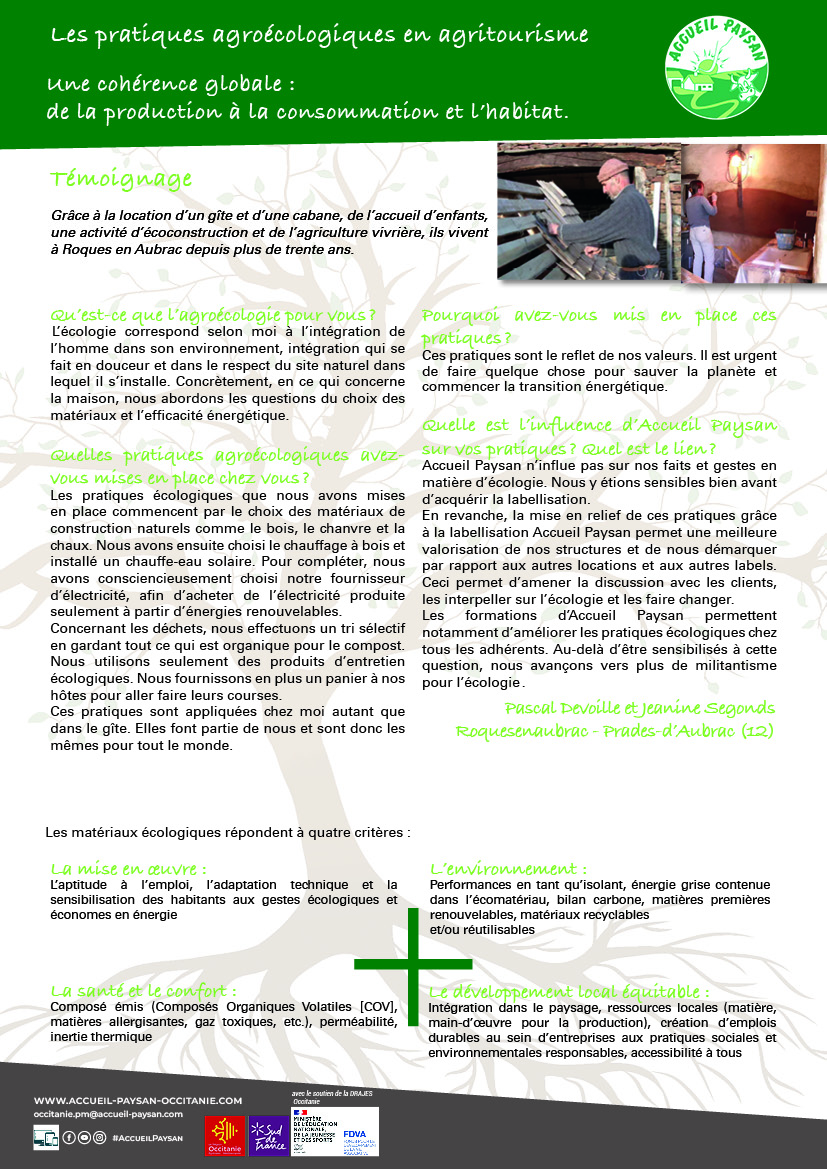 Ces choix sont également intégrés dans l’organisation de l’accueil touristique : limitation des consommations d’eau dans les hébergements, utilisation de toilettes sèches, tri des déchets, information des visiteurs sur les éco-gestes, recours à des matériaux durables pour l’aménagement des espaces d’accueil. L’objectif est de proposer des séjours cohérents avec les valeurs de l’agriculture paysanne, en évitant de dissocier pratiques agricoles et pratiques touristiques.