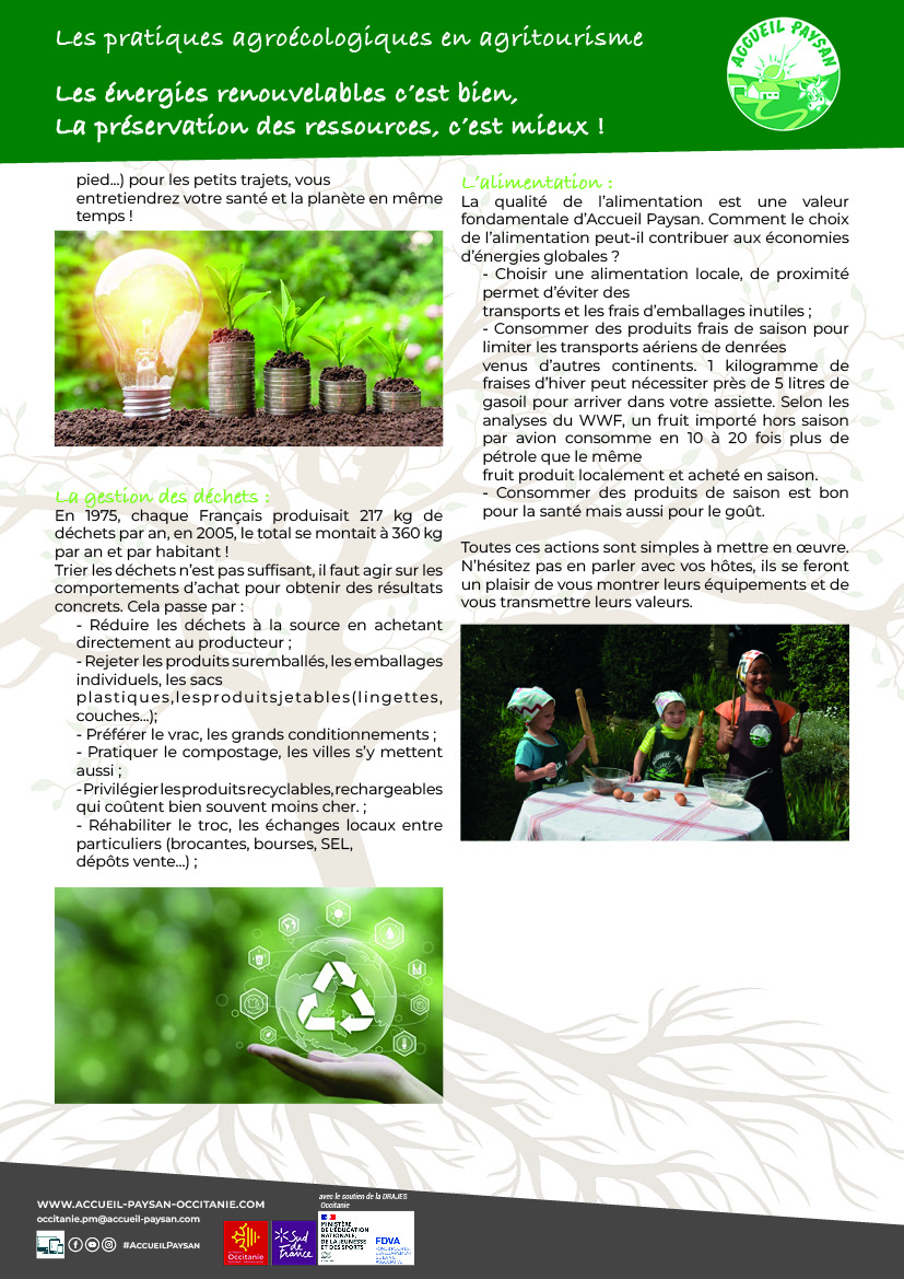 Les pratiques agroécologiques intègrent une gestion raisonnée des ressources naturelles, notamment de l’eau, de l’énergie et des matières premières. De nombreuses fermes du réseau mettent en œuvre des dispositifs de récupération des eaux de pluie, d’optimisation des consommations, de réduction des gaspillages et de valorisation des déchets organiques par le compostage.